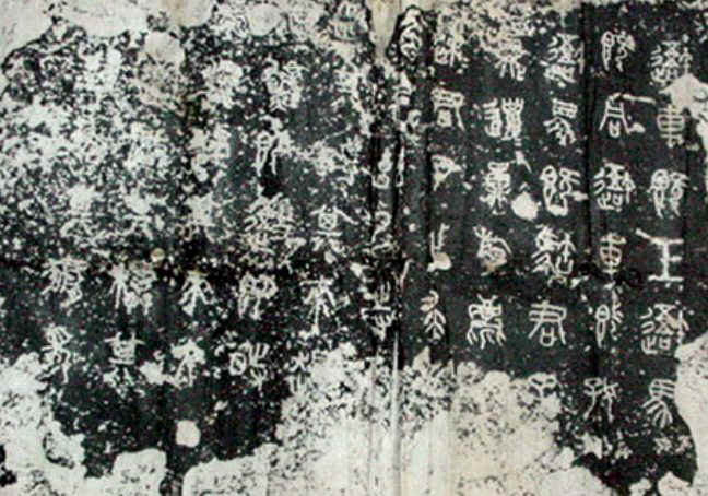 Great Seal Scripts are not very different from Ancient Scripts (Gu Wen 古 文 ). They are a synthesis of the variants of Ancient Scripts. The most famous example of Great Seal Scripts is Stone Drum Inscriptions ("Thu Gu Wen" 石 鼓 文 ), so named because the characters were engraved onto the tops and sides of ten large stones shaped like drums. These drums opened an important era of Chinese calligraphy and are the first known examples of Chinese calligraphy engraved onto stone. The drums were discovered in the province of Shang Xi in the early Tang Dynasty (c. 618). The inscriptions on these Stone Drums may be seen at the Temple of Confucius in Beijing. It has been the subject of Chinese calligraphy, linguistics, and archaeology for centuries. The famous Tang Dynasty writer, Han Yu, published a long poetic eulogy in praise of these characters. Unfortunately, only two hundred characters remain, and many versions of rubbings of those characters taken by scholars and craftsmen have made the stones in even worn conditions.